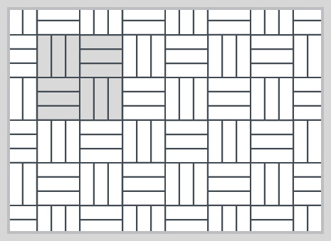 This design is suited for expansive floors. It uses a combination of squares and rectangles that creates a woven effect. This tiling pattern uses little cutting and breakages, so having an extra 10% will be just enough.