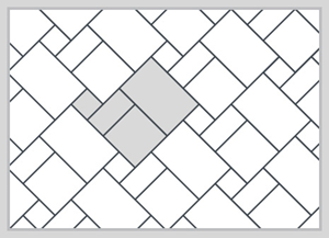 This laying design involves 3 different tile sizes. When tiles are laid in this pattern, leave 10% extra for cuts and breakages. Many tile companies manufacture sets that are especially designed for modular laying pattern.
